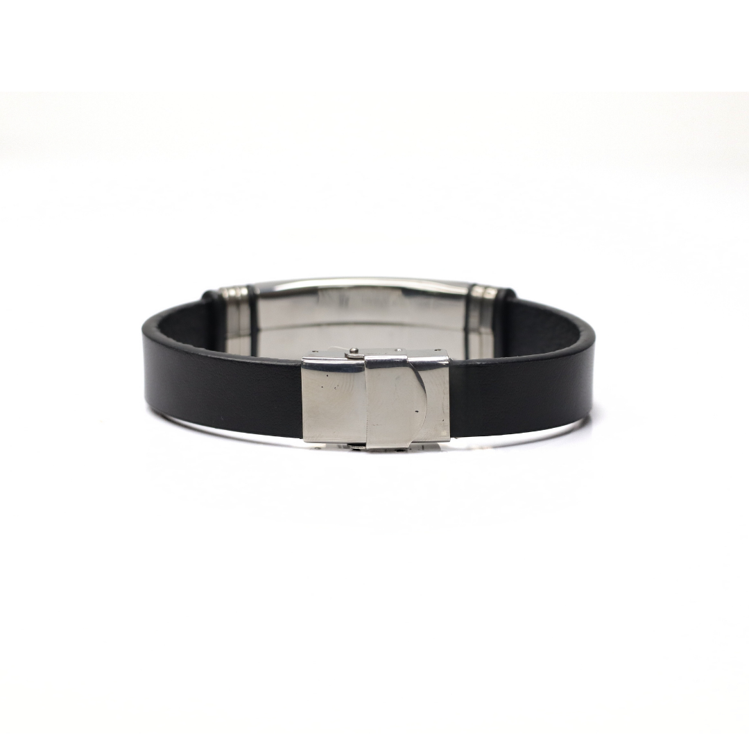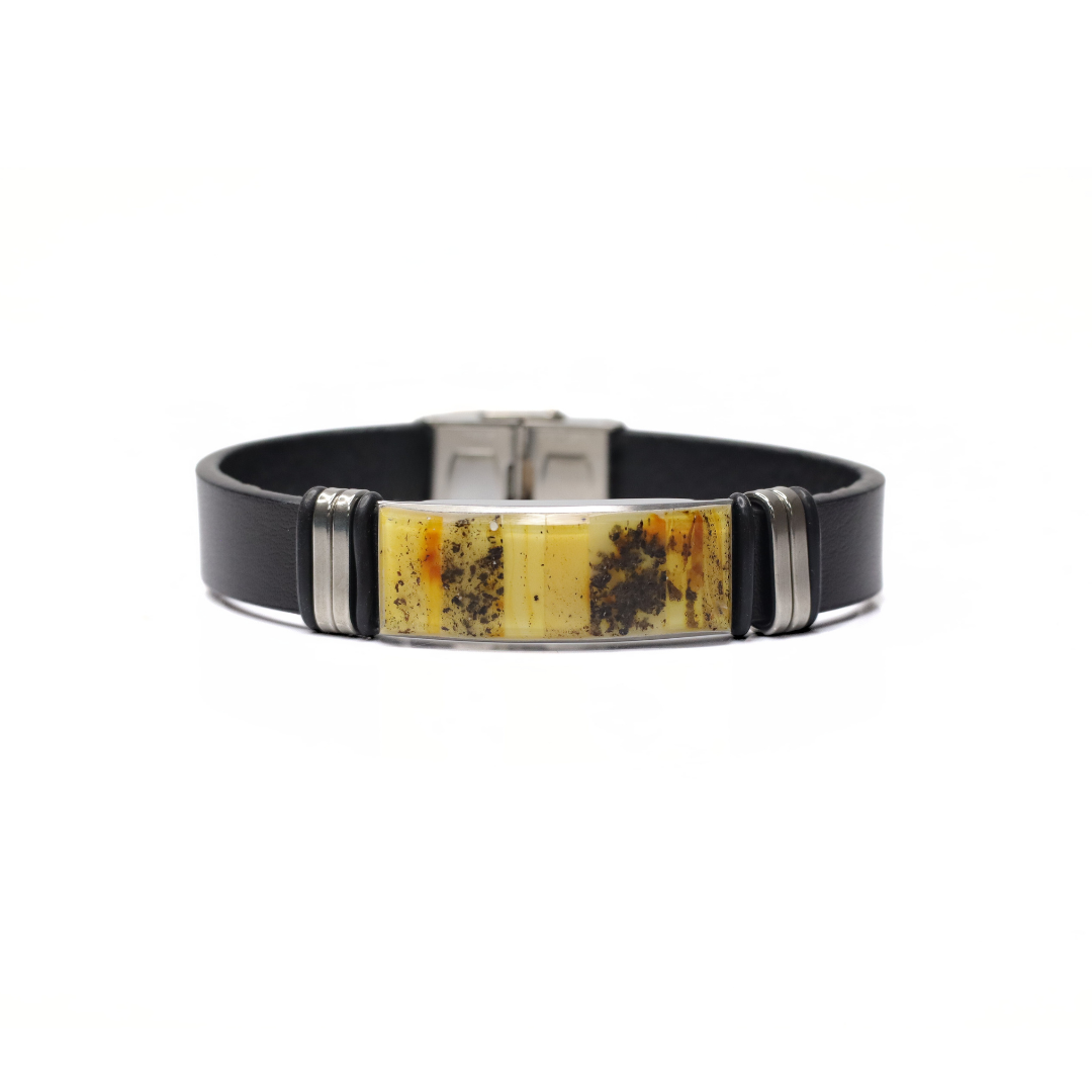 Nowoczesna męska bransoletka wykonana z czarnej skóry naturalnej i stali, ozdobiona fragmentem bursztynu bałtyckiego w mleczno-brązowych odcieniach. Elegancki dodatek podkreślający styl i charakter.