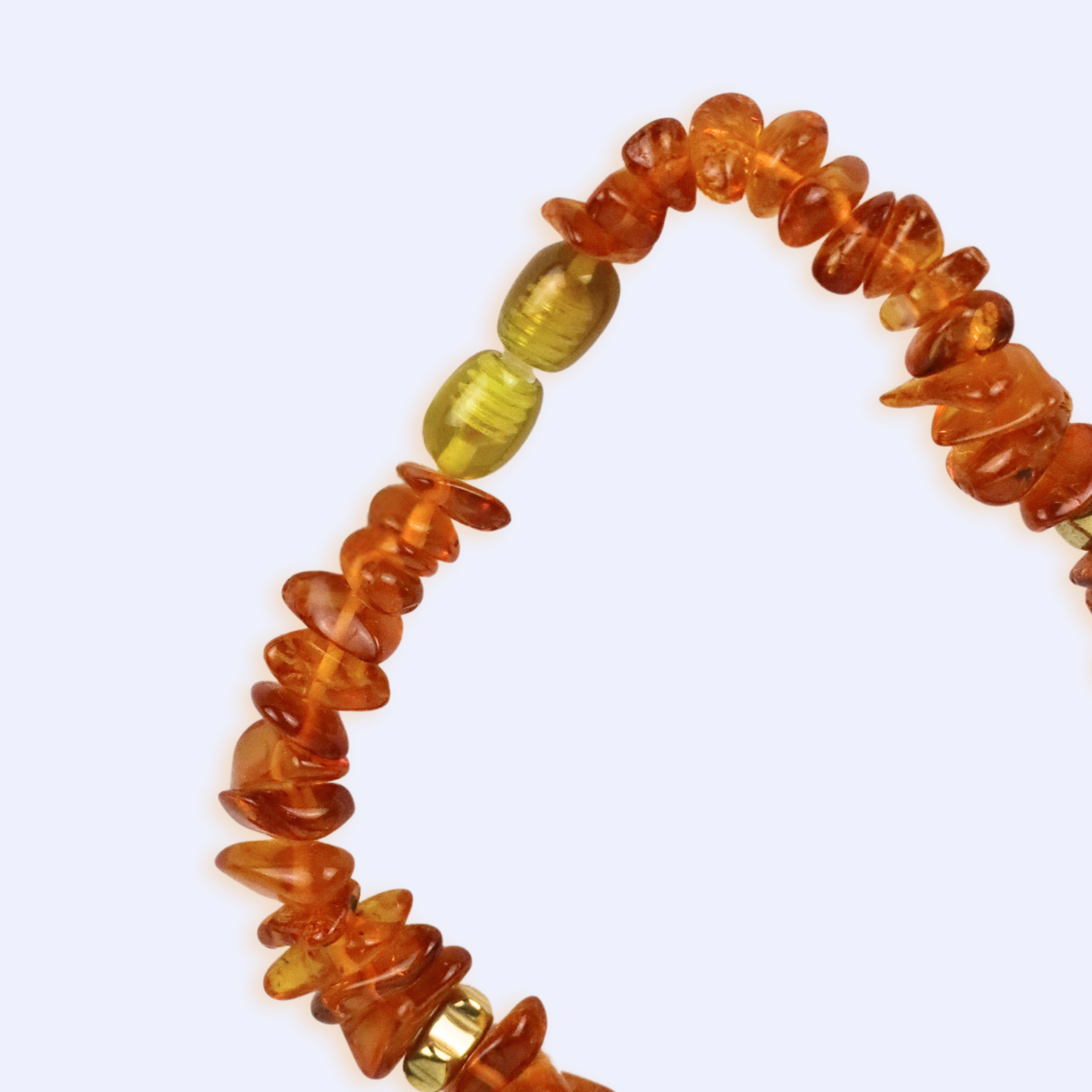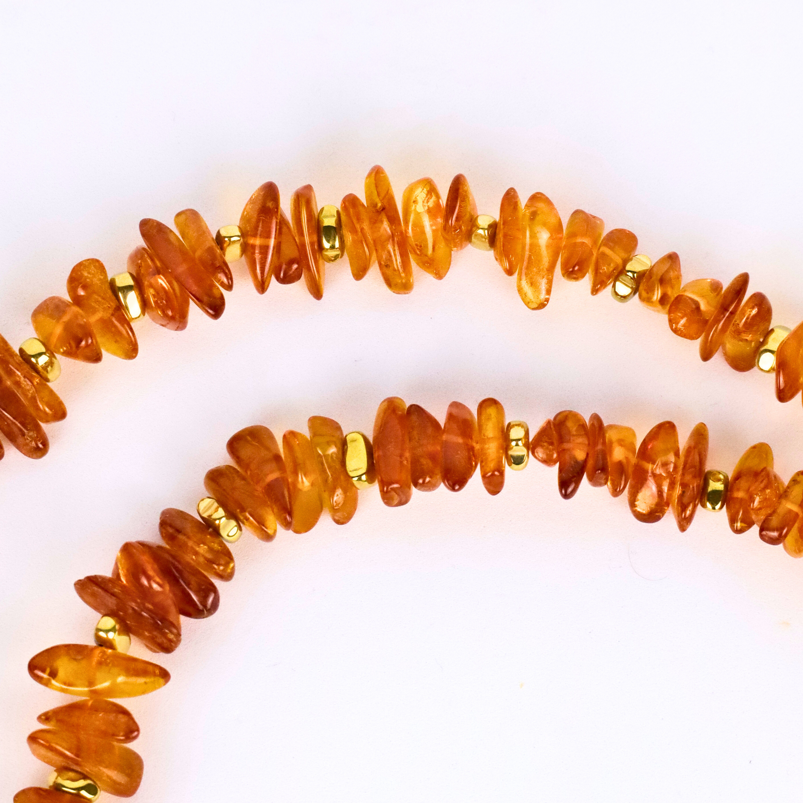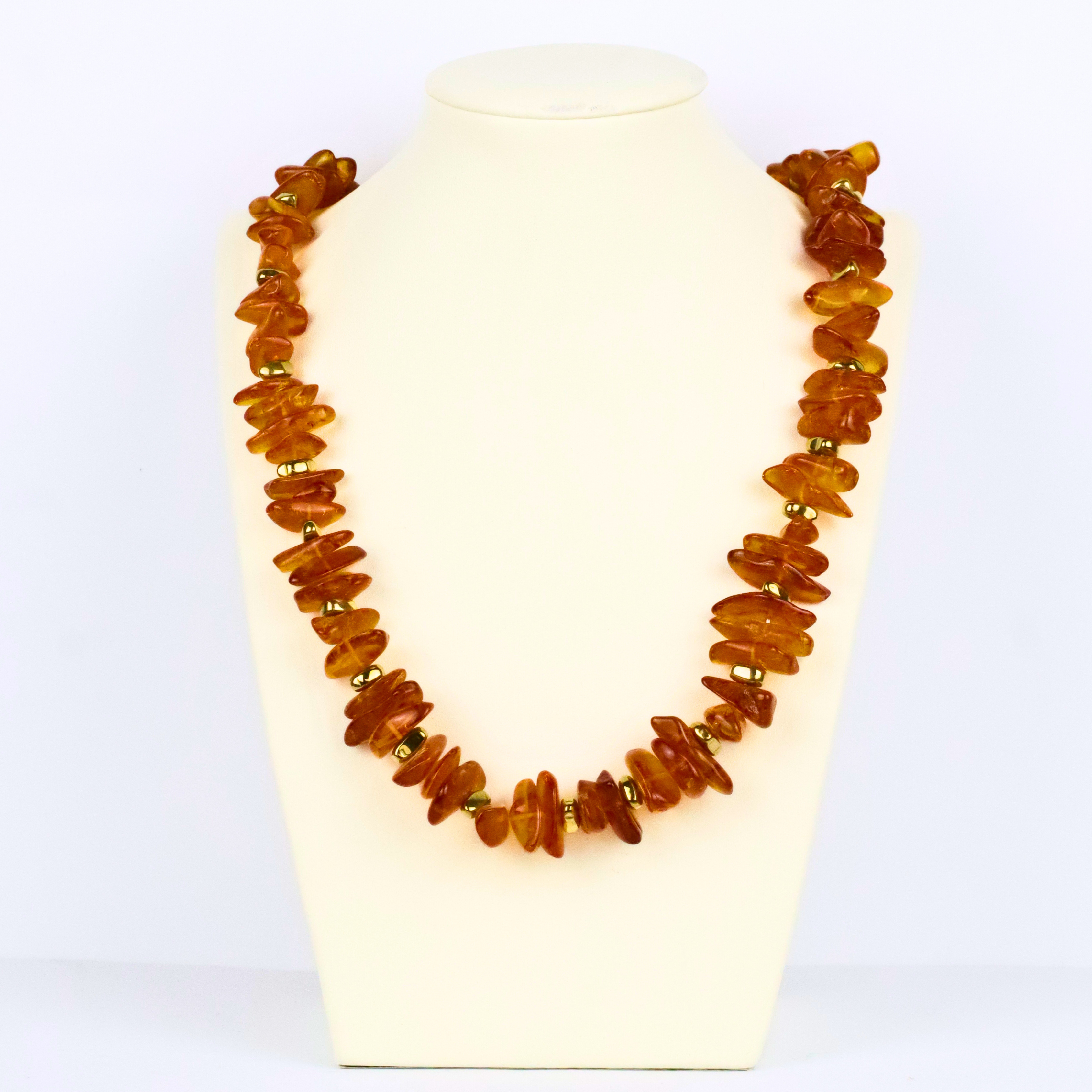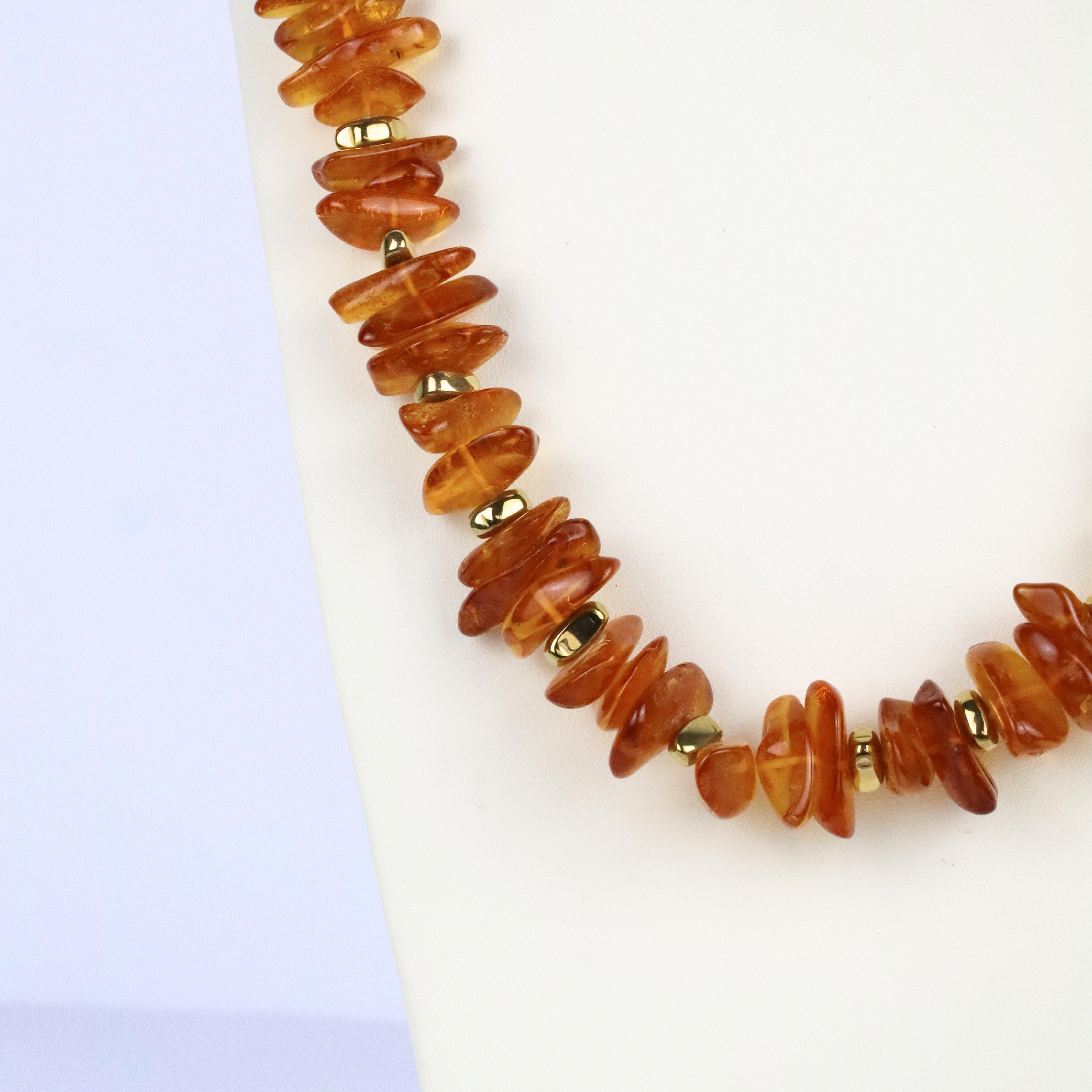 Ręcznie wykonany naszyjnik z naturalnego bursztynu w odcieniach koniaku i miodu, wzbogacony o dekoracyjne elementy w kolorze złota. Nieregularne kształty kamieni podkreślają jego autentyczność i niepowtarzalność.