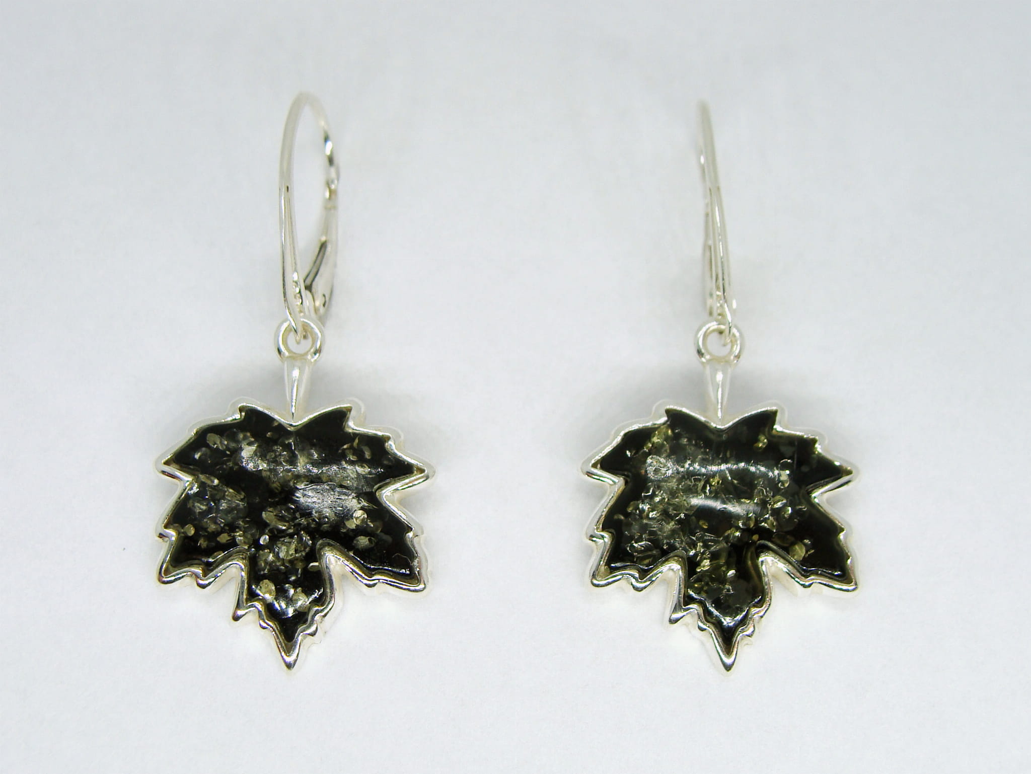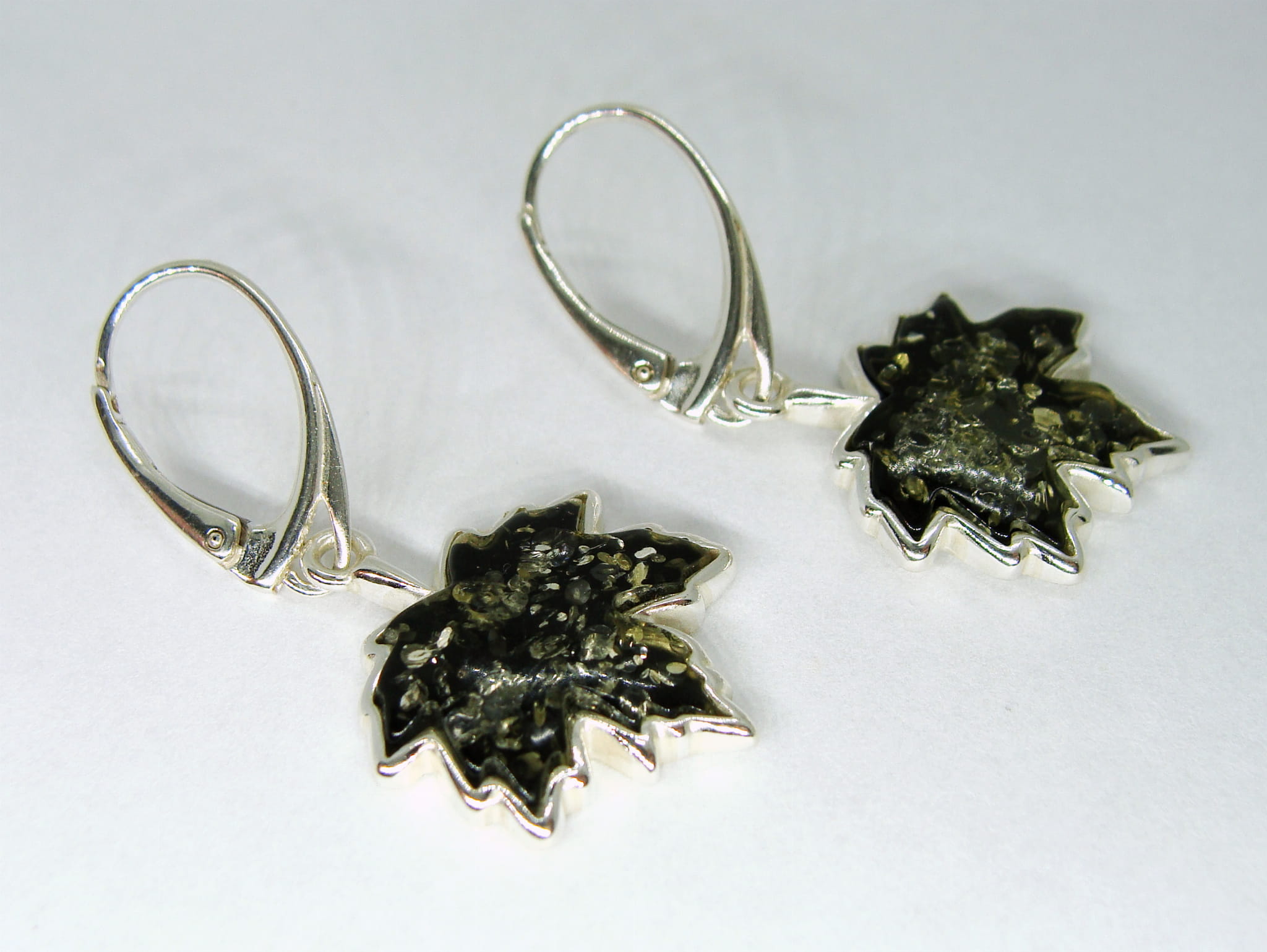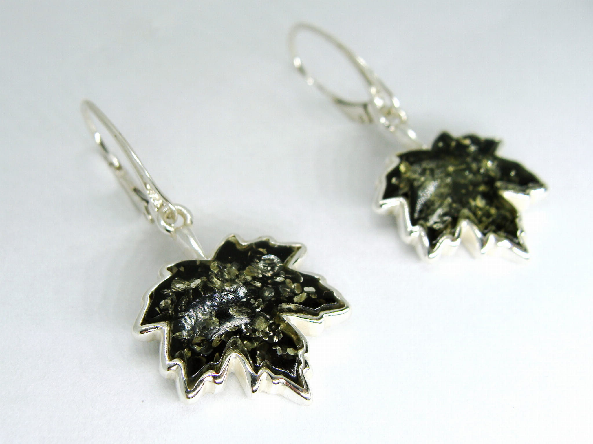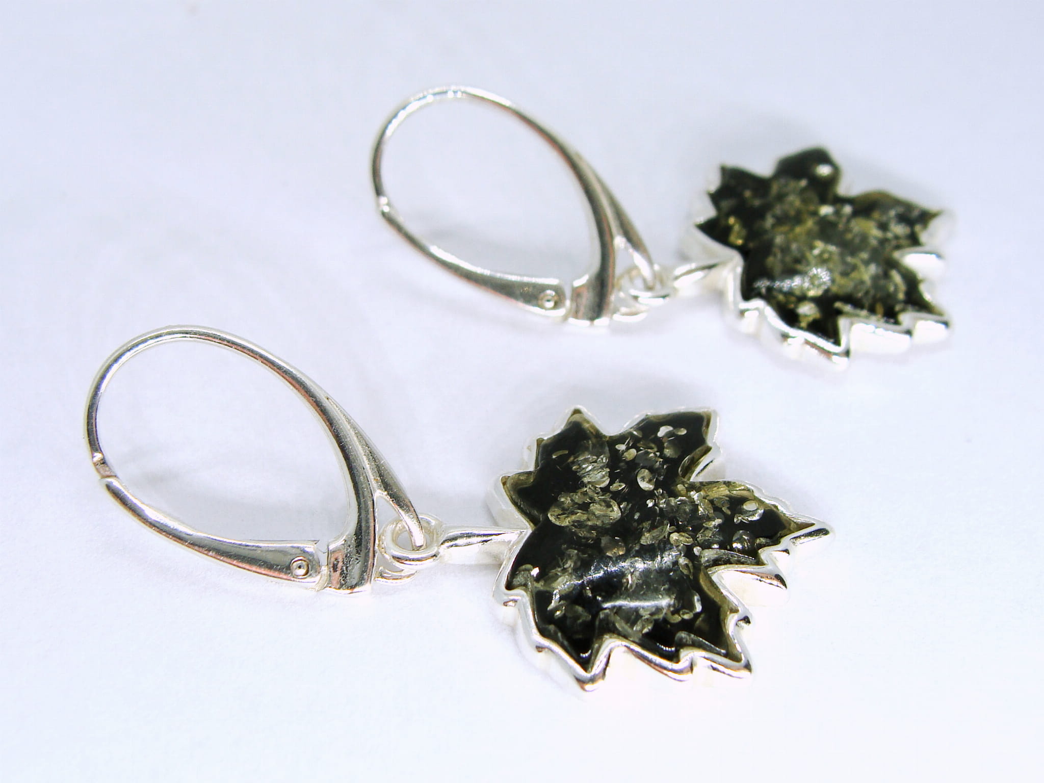 Wiszące kolczyki w kształcie listka wykonane ze srebra. Ich ozdobą jest bursztyn o pięknej, zielonej barwie.