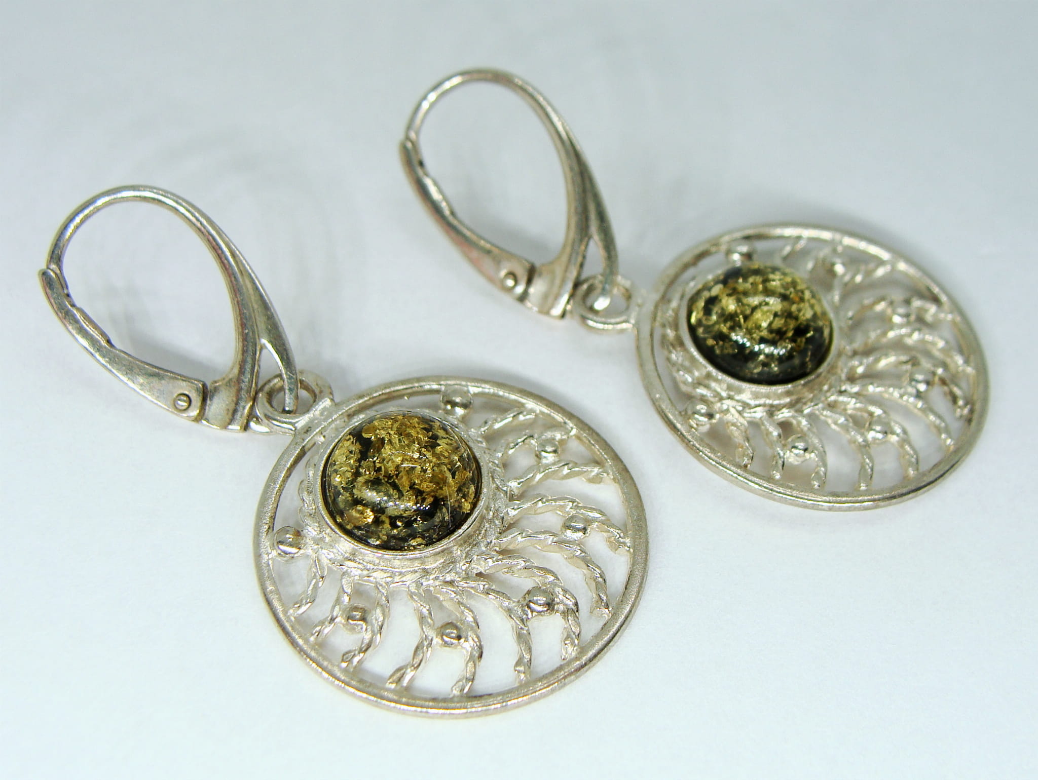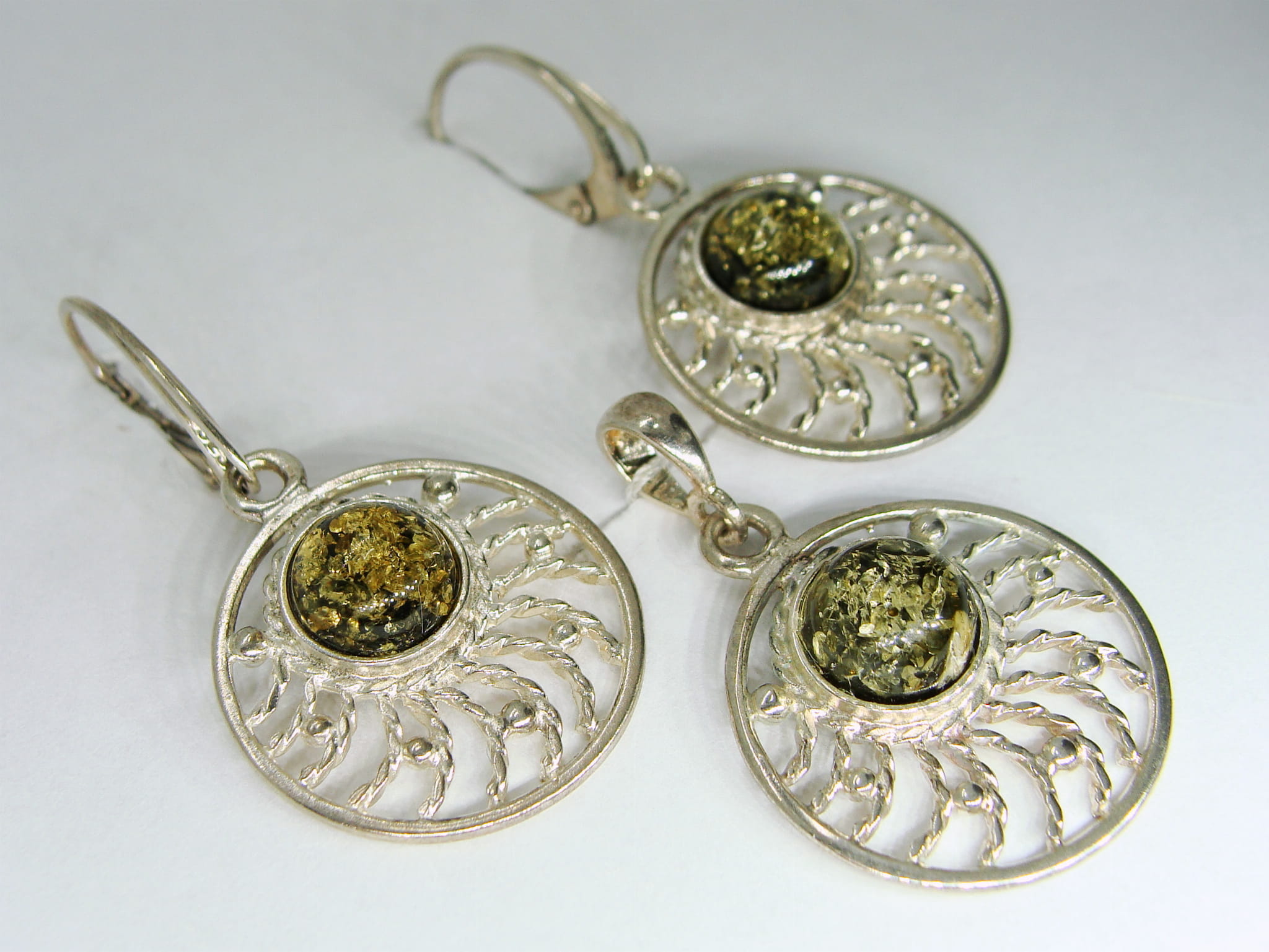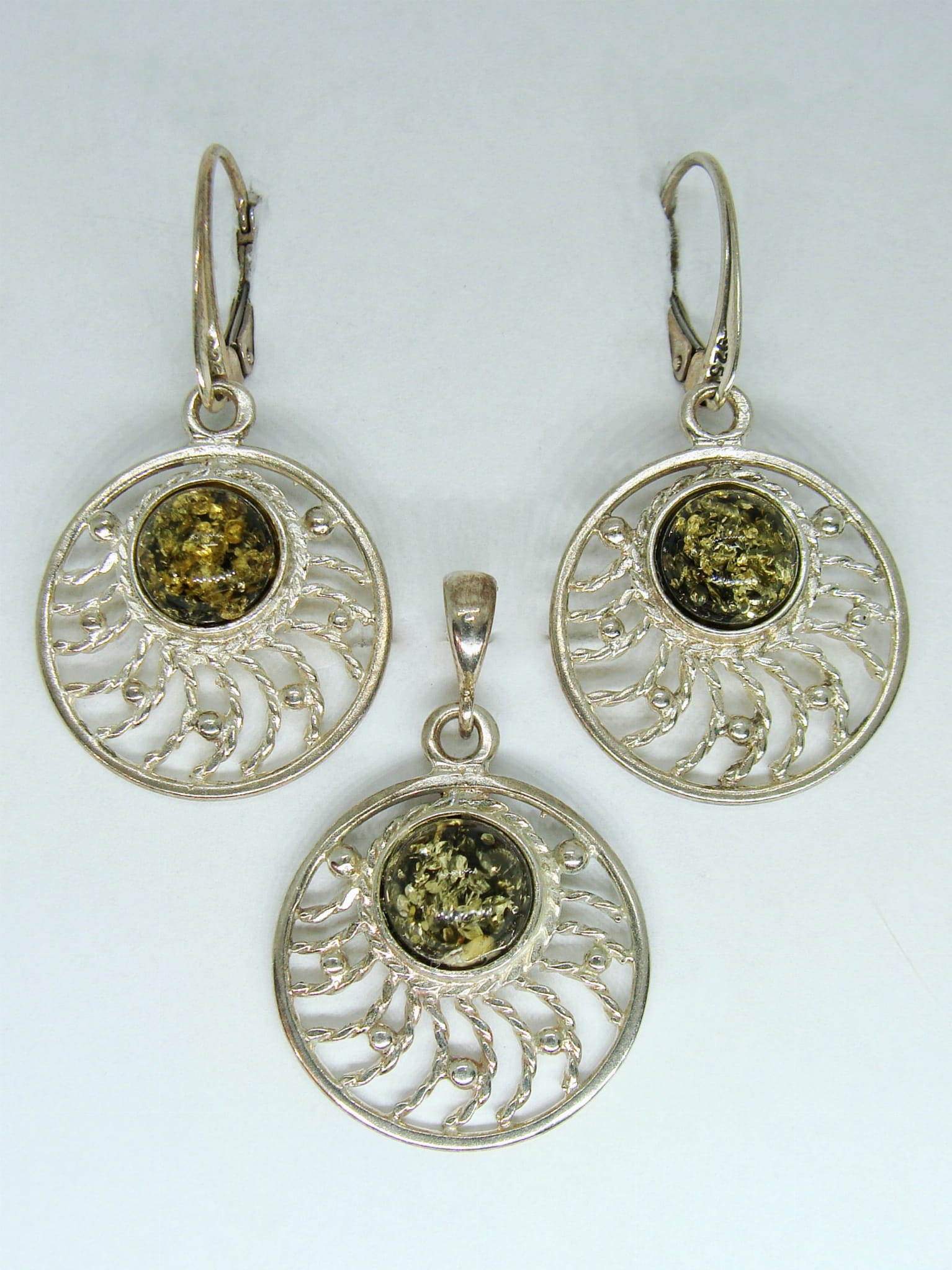 Komplet - kolczyki i zawieszka - wykonany ze srebra, na którym umieszczone są okrągłe bursztyny w zielonej barwie.