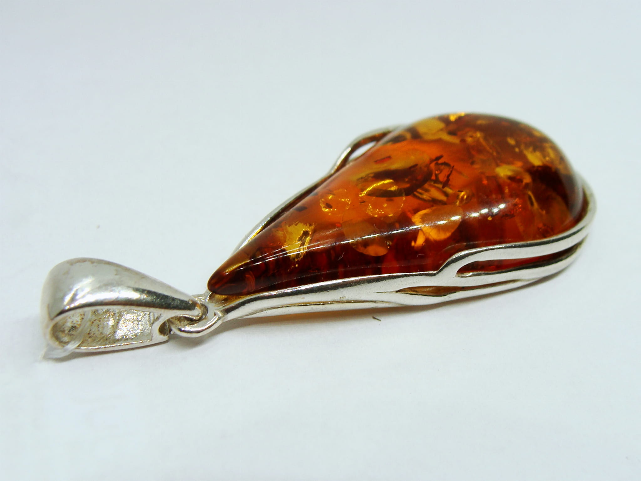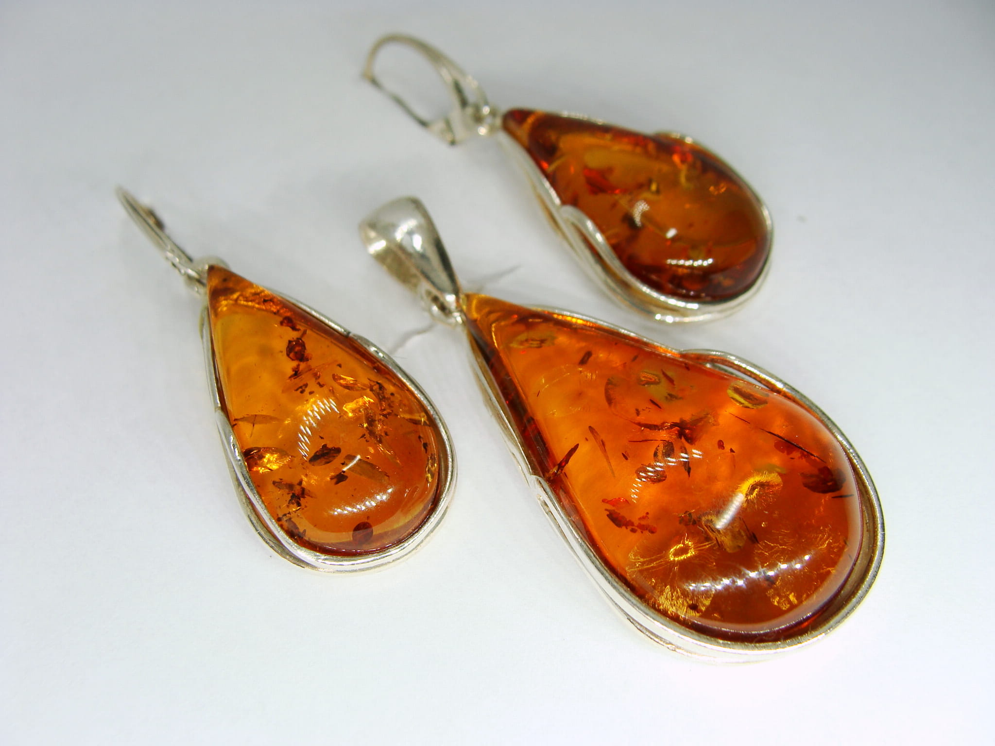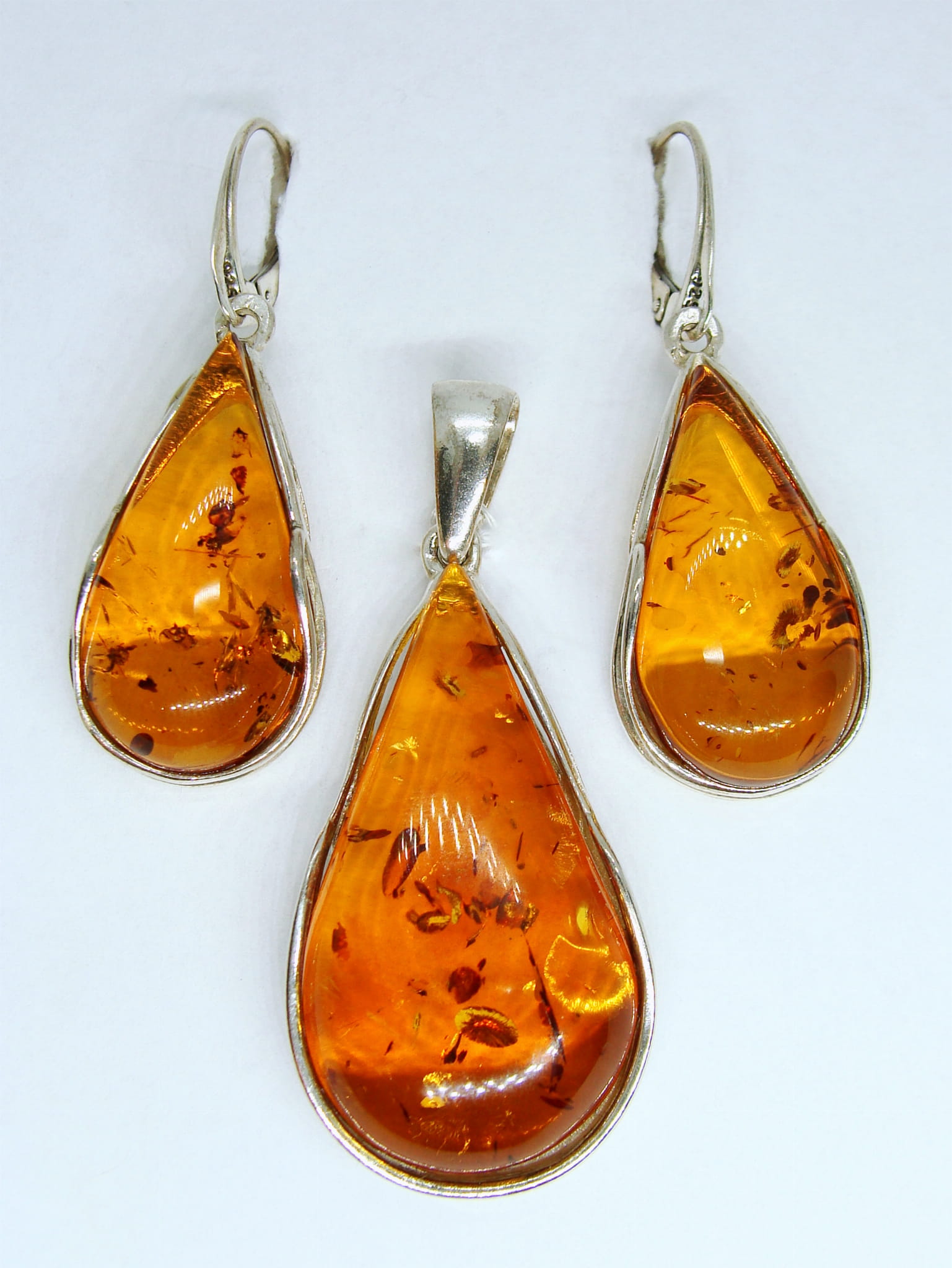 Okazały komplet - kolczyki i zawieszka - wykonany ze srebra, na którym umieszczone są miodowe bursztyny w kształcie kropli.