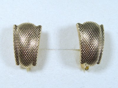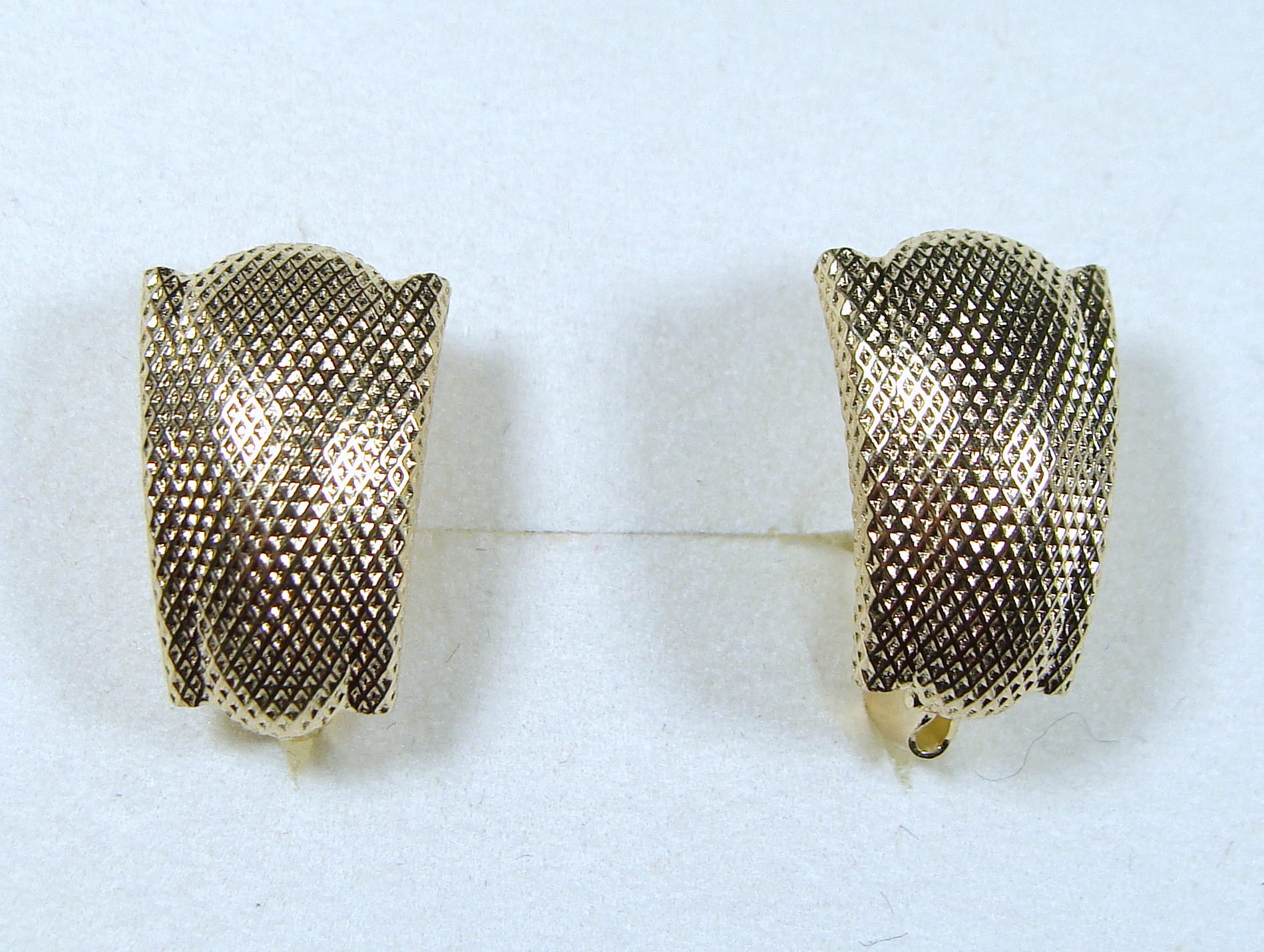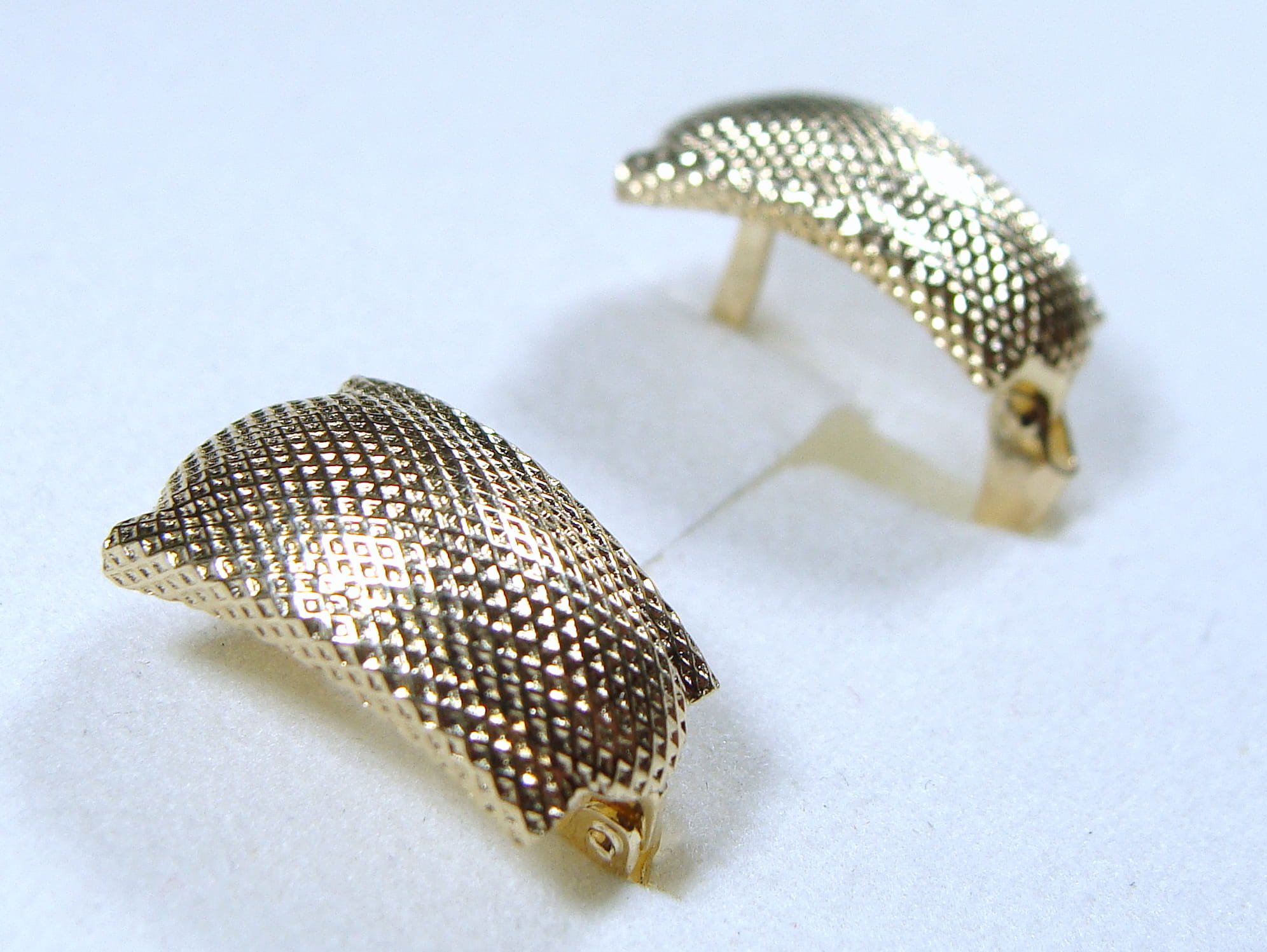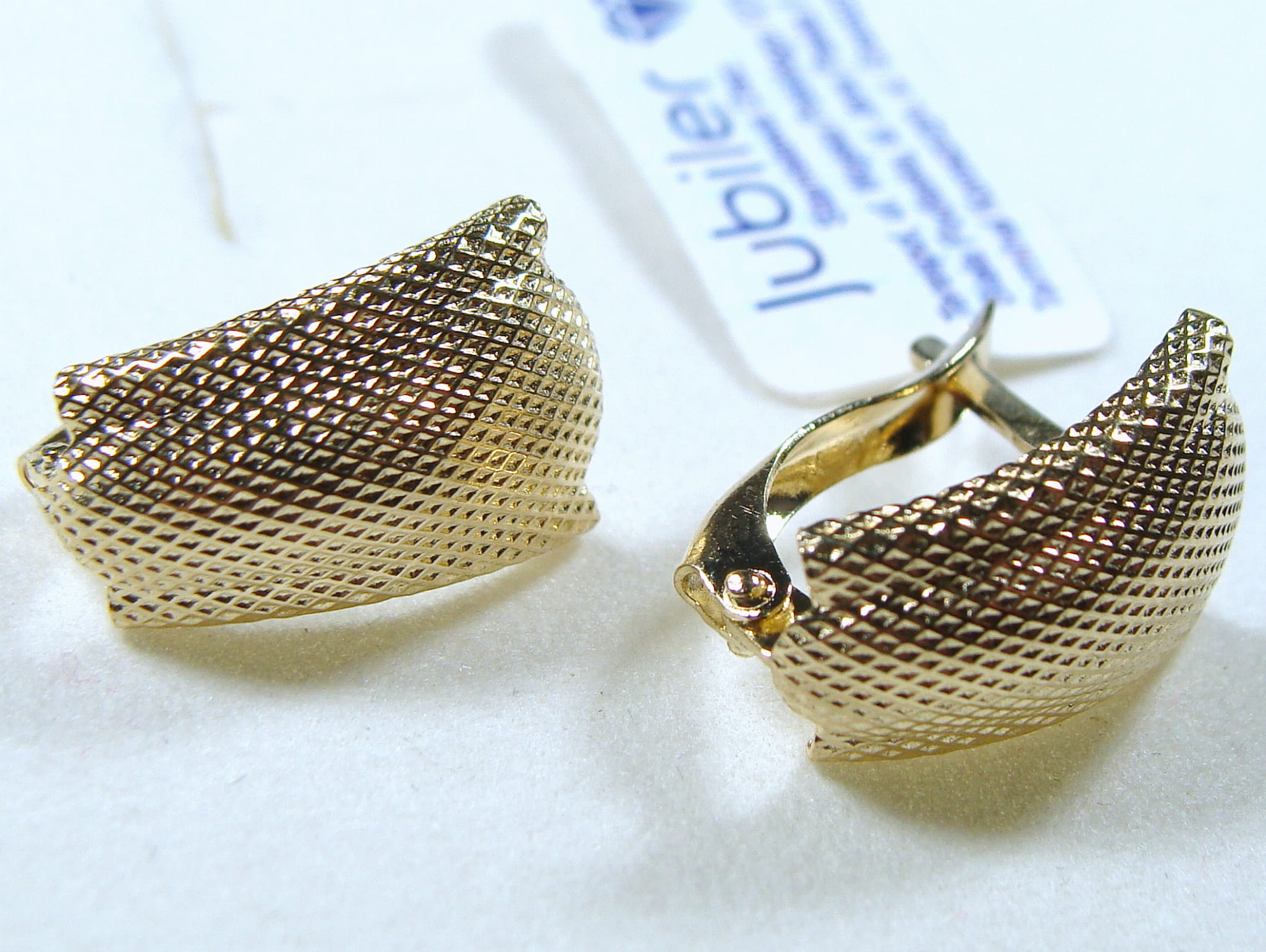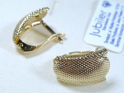 Kolczyki ze złota w kolorze żółtym. Zdobione ozdobnym tłoczeniem, które nadaje złotu ciekawą strukturę. Zapinane na angielskie zapięcie.
