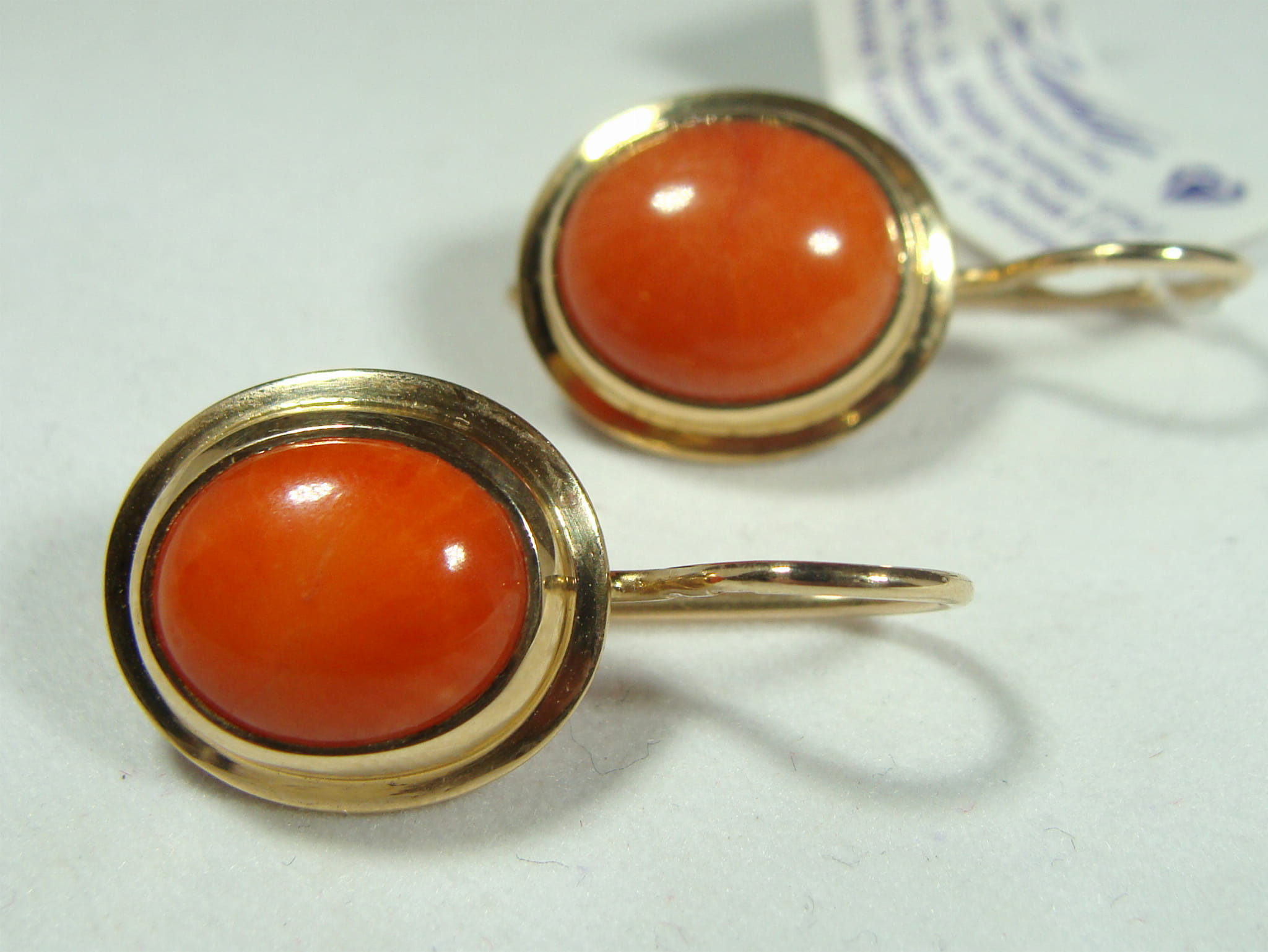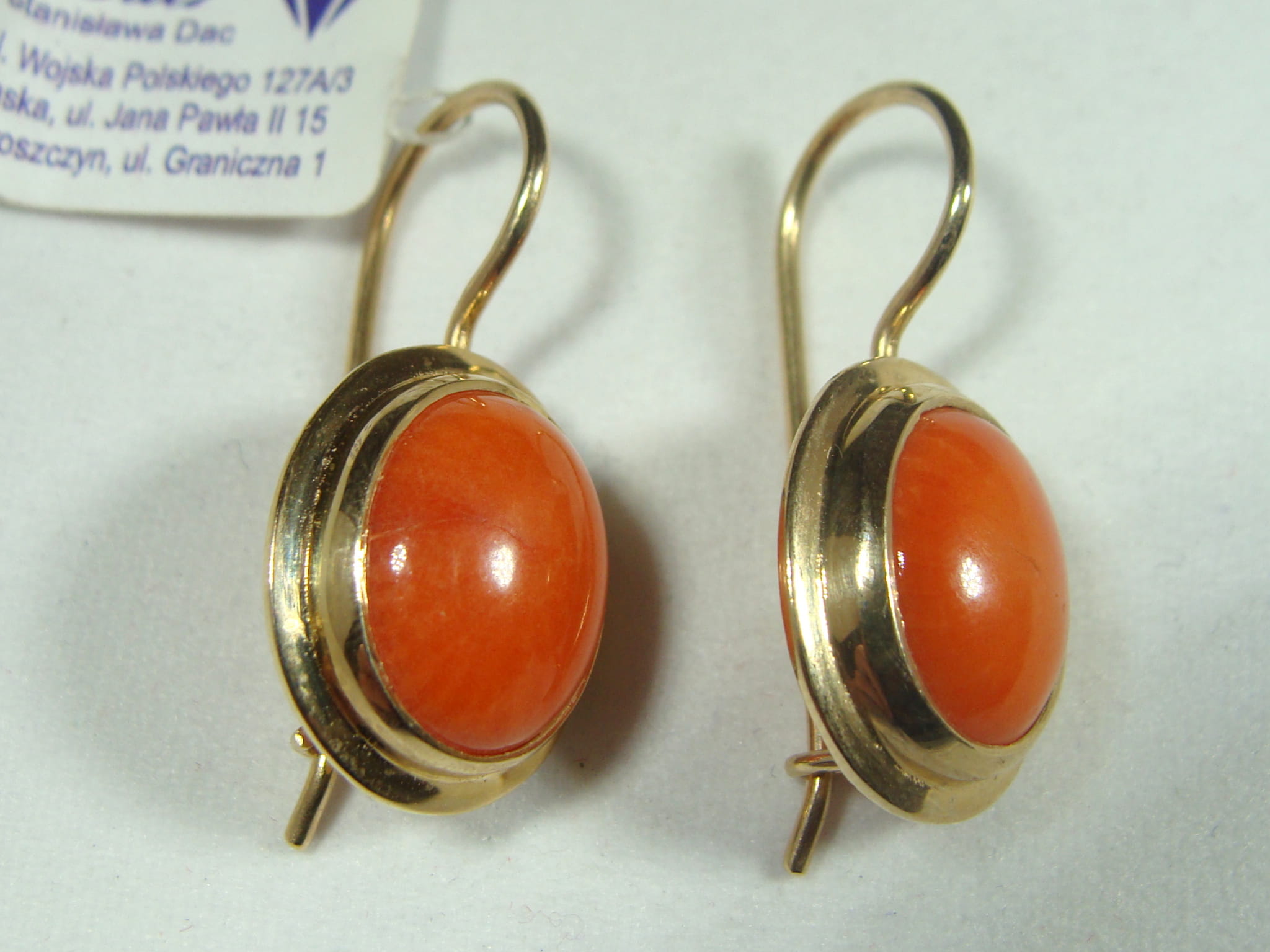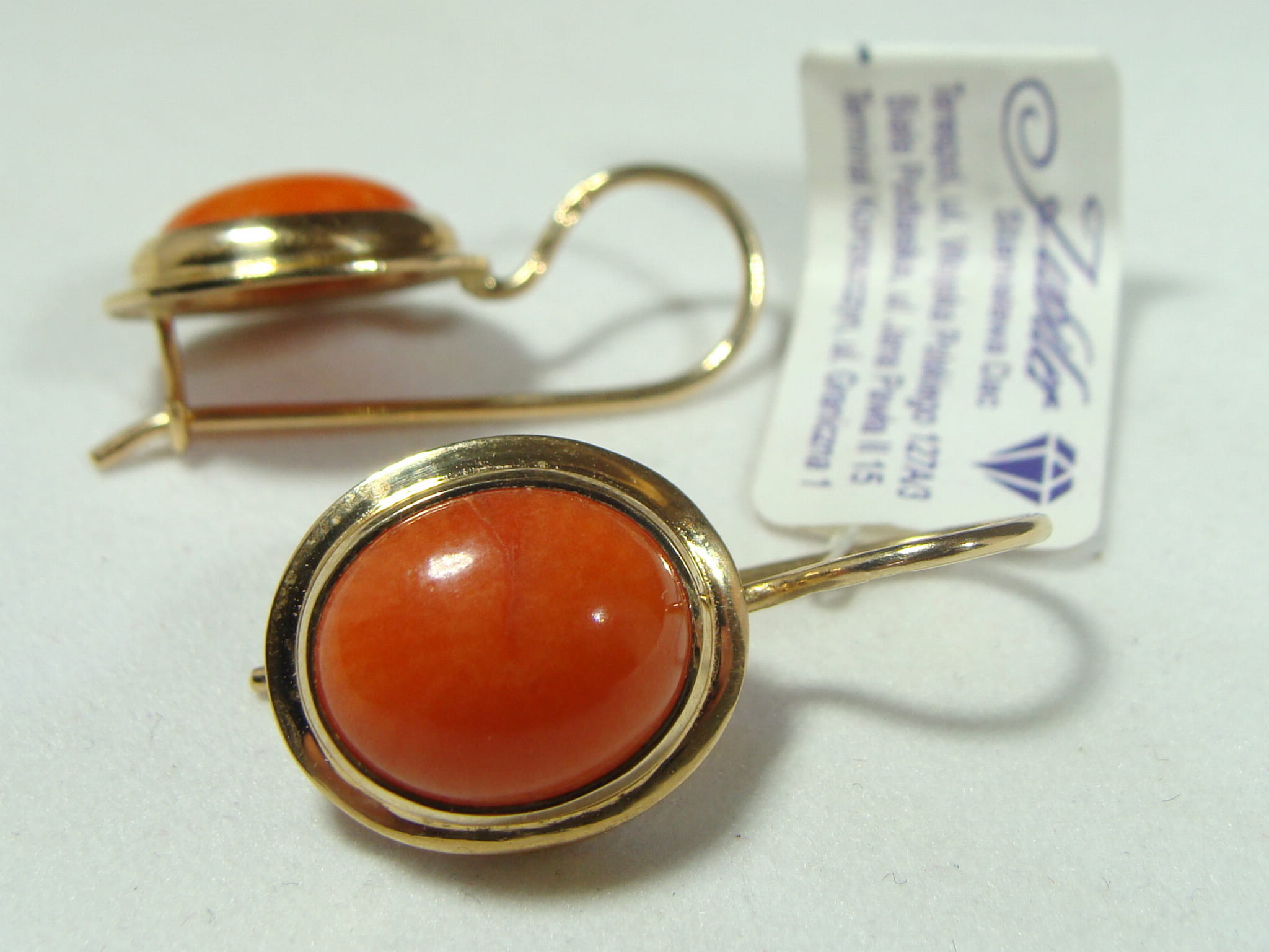 Wiszące kolczyki zapinane na bigiel, wykonane ze złota. Koral w subtelnej złotej oprawie.