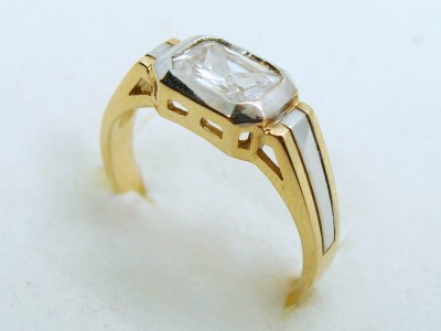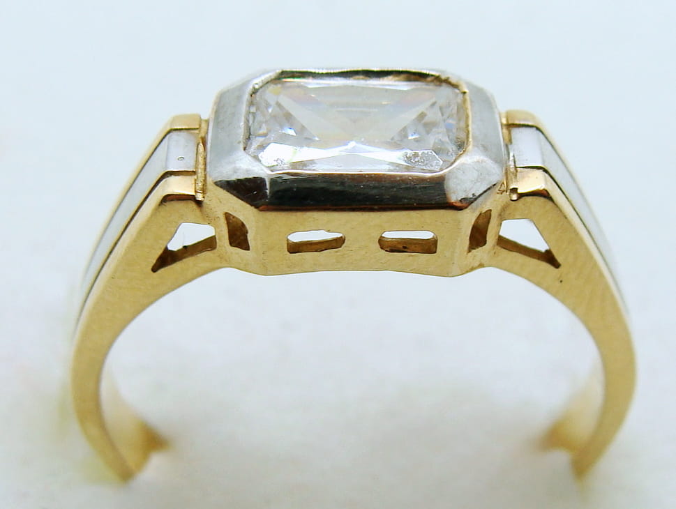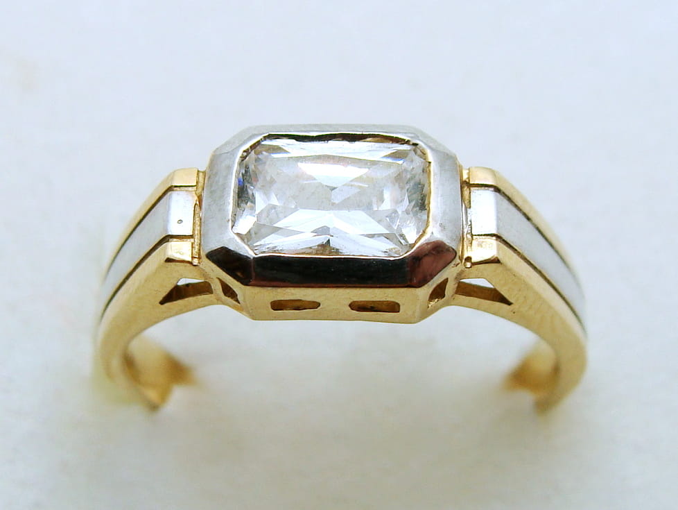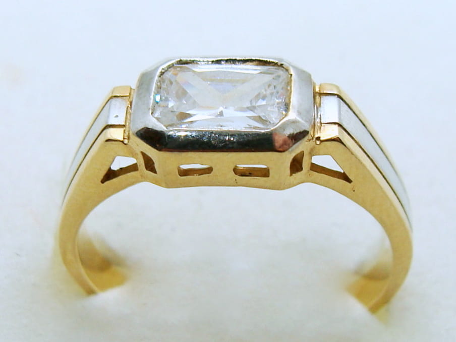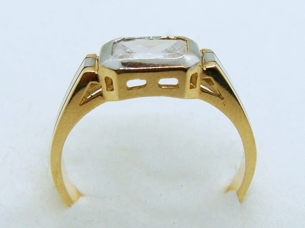 Pierścionek wykonany ze złota w kolorze żółtym z dodatkiem białego złota. Wzór ozdobiony cyrkonią.