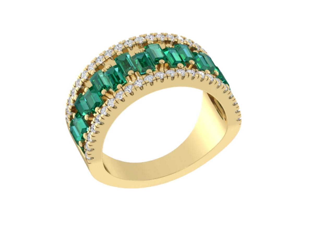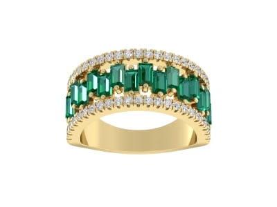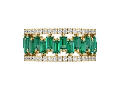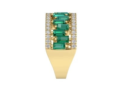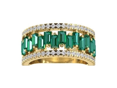 Wyjątkowy, szeroki pierścionek ze szmaragdami o niezwykłej barwie w otoczeniu brylantów to luksusowa biżuteria złota.