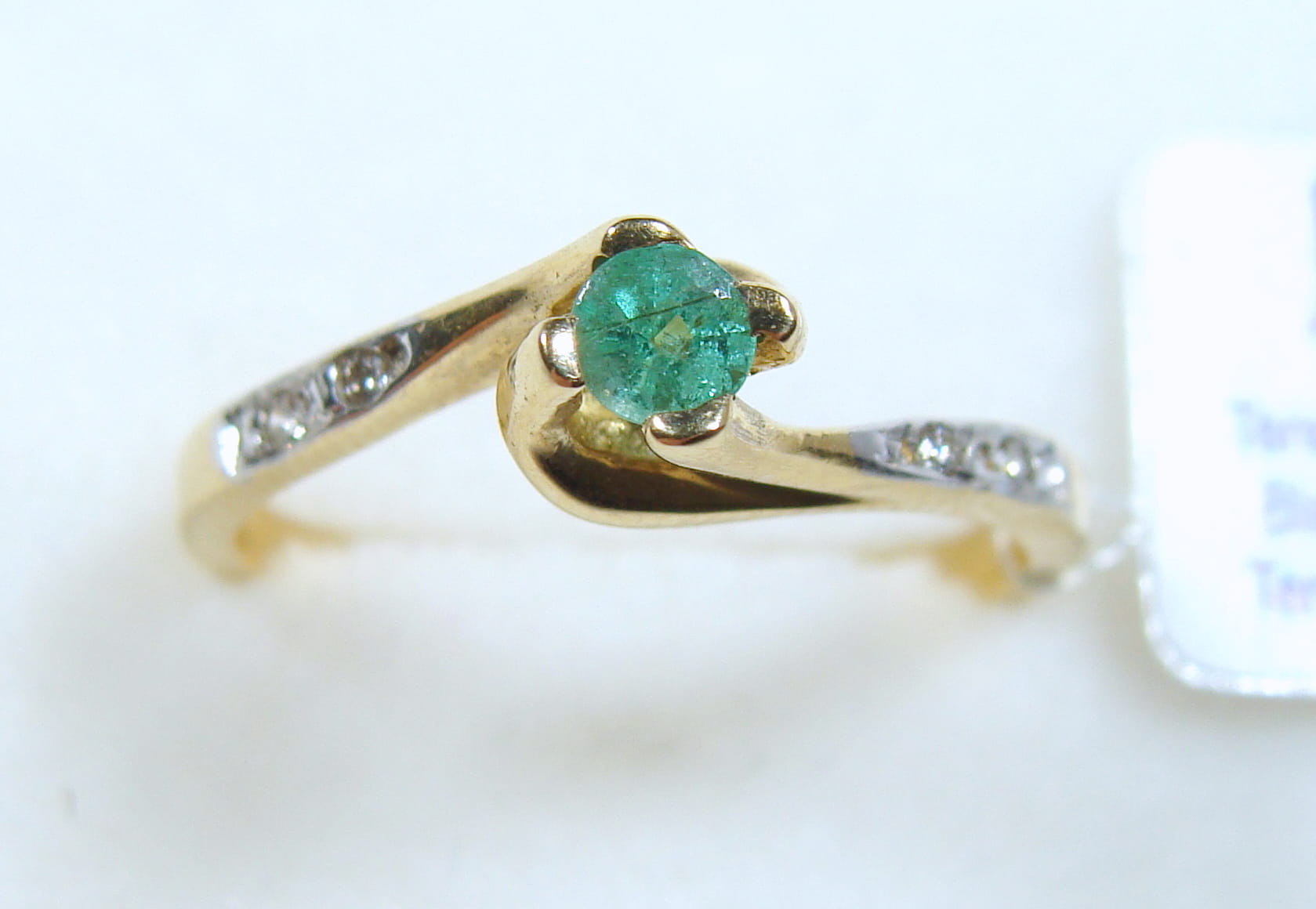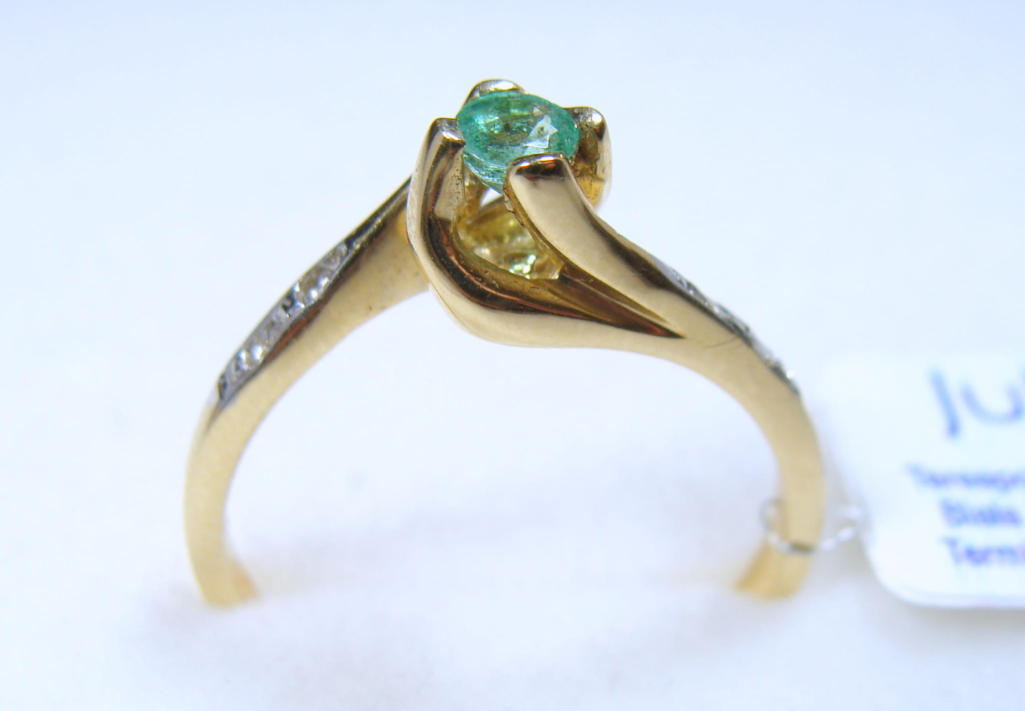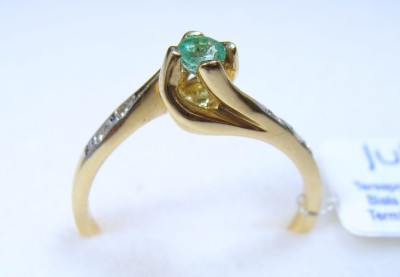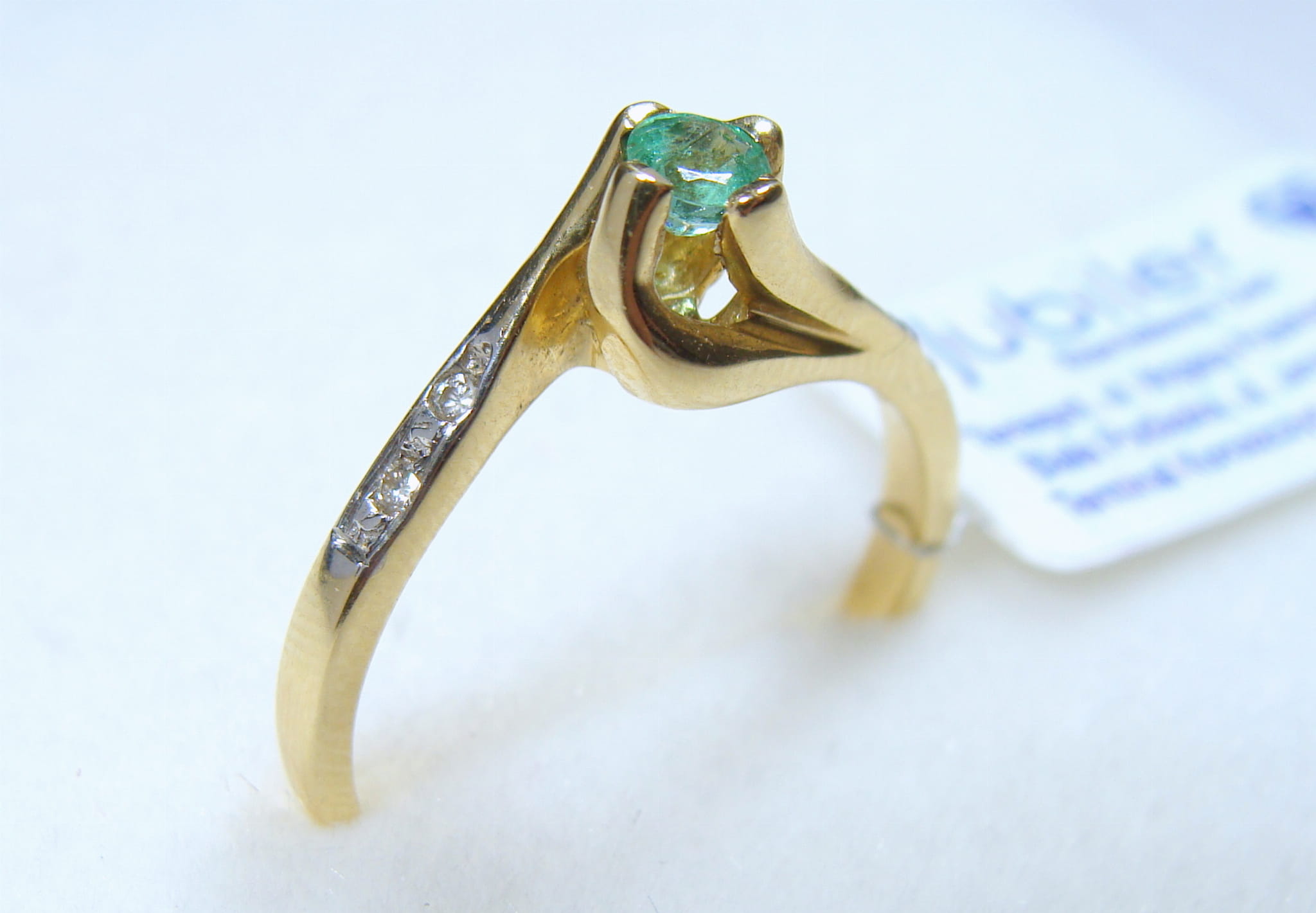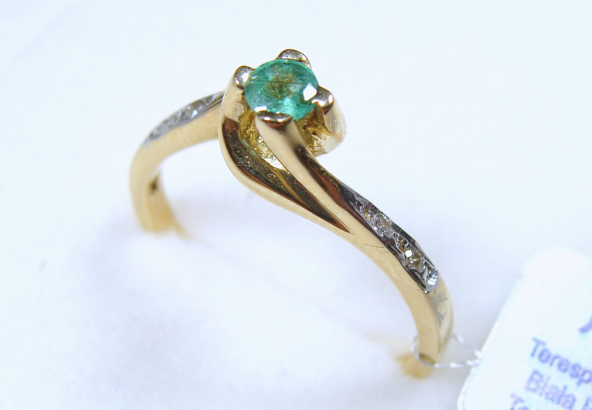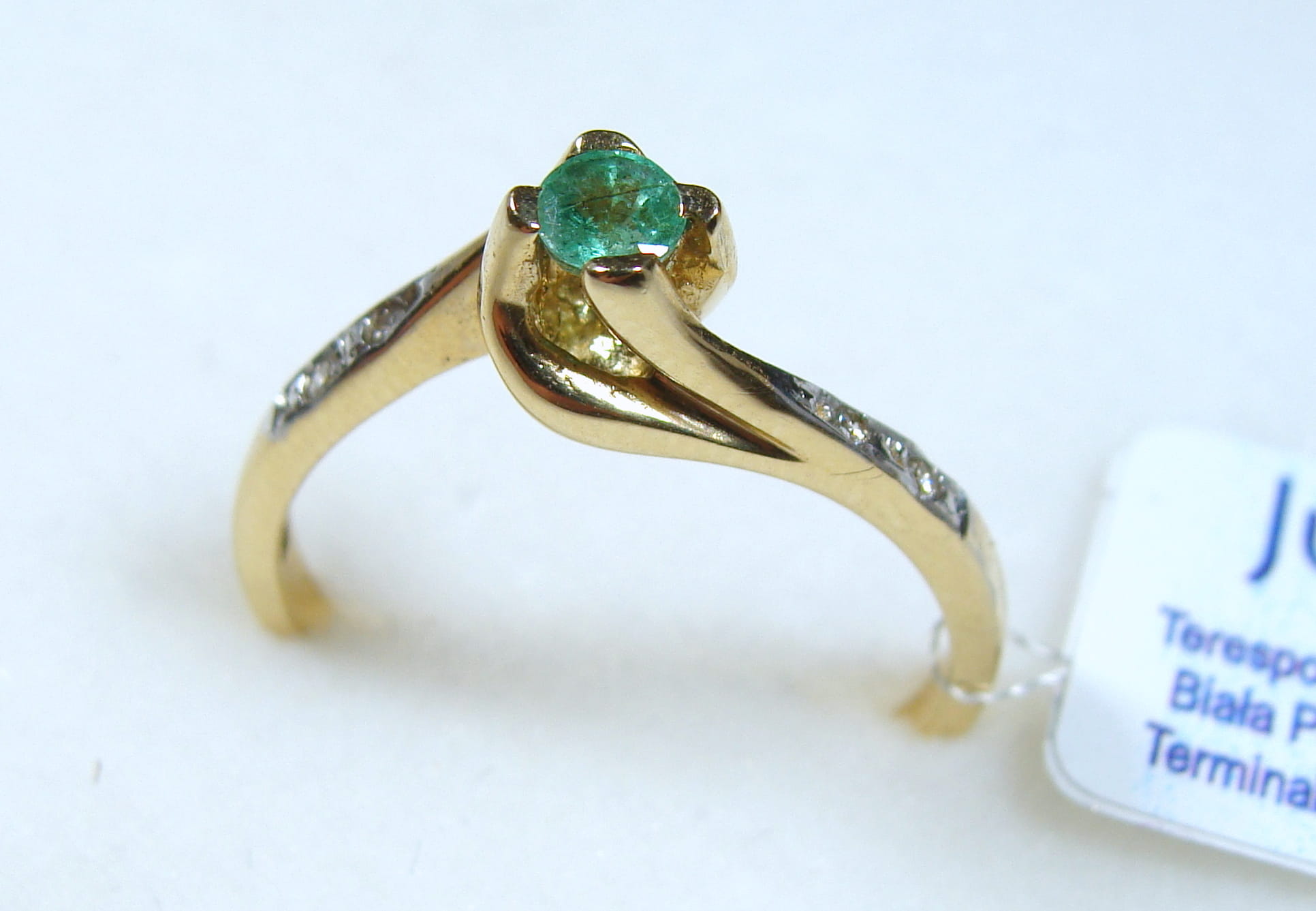 Pierścionek wykonany ze złota z oprawionymi kamieniami - szmaragdem i brylantami.